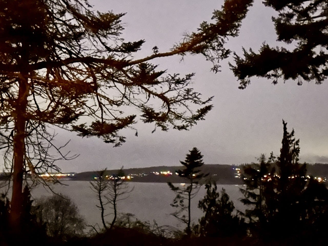 I arrived at 3:30, put the groceries away, unpacked my clothes and toiletries, and sat down in the upholstered chair in the living room to get started. To the right, the view opened through the evergreens to Puget Sound.